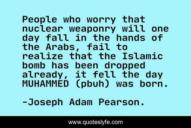 This page presents the quote "People who worry that nuclear weaponry will one day fall in the hands of the Arabs, fail to realize that the Islamic bomb has been dropped already, it fell the day MUHAMMED (pbuh) was born.". Author of this quote is Joseph Adam Pearson.. This quote is about beautiful, love, morals, arabs, born, atomic, earth, islam, discipline,.