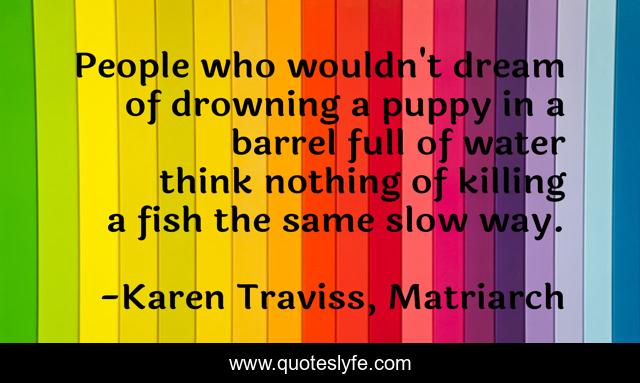 This page presents the quote "People who wouldn't dream of drowning a puppy in a barrel full of water think nothing of killing a fish the same slow way.". Author of this quote is Karen Traviss, Matriarch. This quote is about moral, wess-har, humanity,.