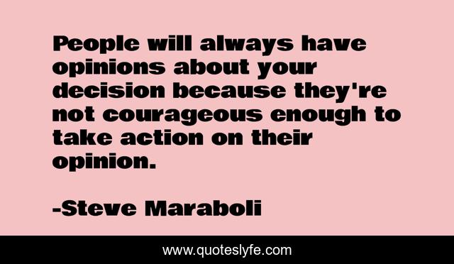 This page presents the quote "People will always have opinions about your decision because they're not courageous enough to take action on their opinion.". Author of this quote is Steve Maraboli. This quote is about opinions, life, people, positive, decision, motivational, confidence, optimistic, inspirational,.