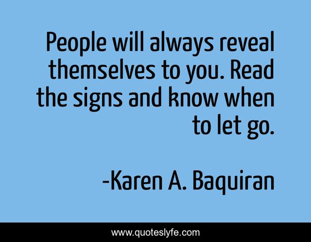 This page presents the quote "People will always reveal themselves to you. Read the signs and know when to let go.". Author of this quote is Karen A. Baquiran. This quote is about letting-go, revealing, loveyourselfmovement,.
