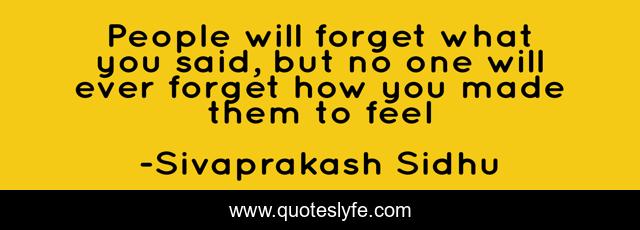 This page presents the quote "People will forget what you said, but no one will ever forget how you made them to feel". Author of this quote is Sivaprakash Sidhu. This quote is about life-and-living, sivaprakash-sidhu, sivaprakash, sivaprakash-gopal, life-lessons, love, feeling, affection,.