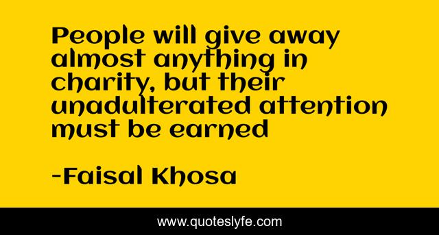 This page presents the quote "People will give away almost anything in charity, but their unadulterated attention must be earned". Author of this quote is Faisal Khosa. This quote is about charity, earned,.