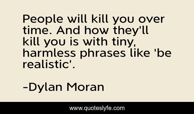 This page presents the quote "People will kill you over time. And how they’ll kill you is with tiny, harmless phrases like ‘be realistic’.". Author of this quote is Dylan Moran. This quote is about enthusiasm, inspirational, self-worth,.