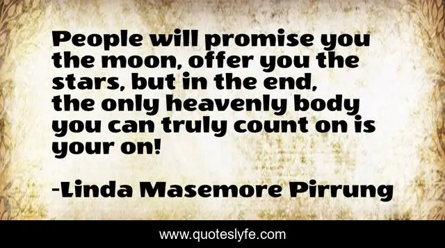 This page presents the quote "People will promise you the moon, offer you the stars, but in the end, the only heavenly body you can truly count on is your on!". Author of this quote is Linda Masemore Pirrung. This quote is about enthusiasm, inspirational, romantic-suspense,.