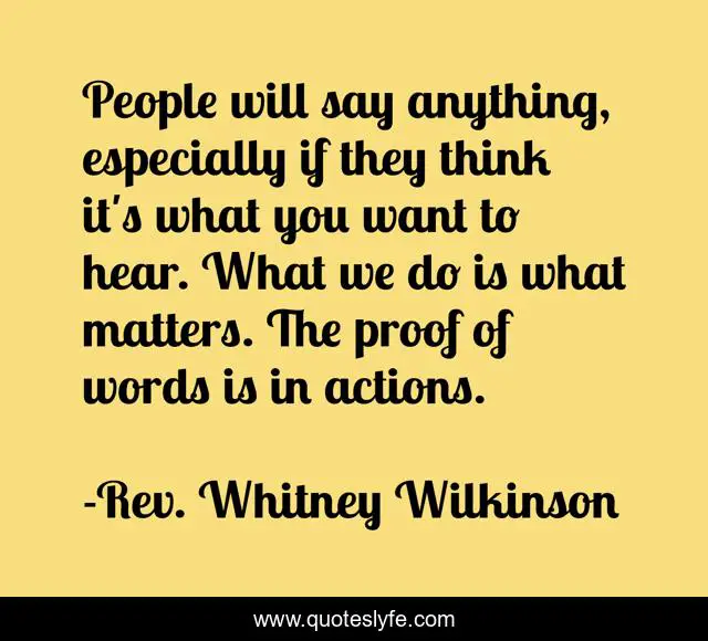 This page presents the quote "People will say anything, especially if they think it's what you want to hear. What we do is what matters. The proof of words is in actions.". Author of this quote is Rev. Whitney Wilkinson. This quote is about faith, inspiring, conviction, authentic, inspirational, action, enthusiasm, religious,.