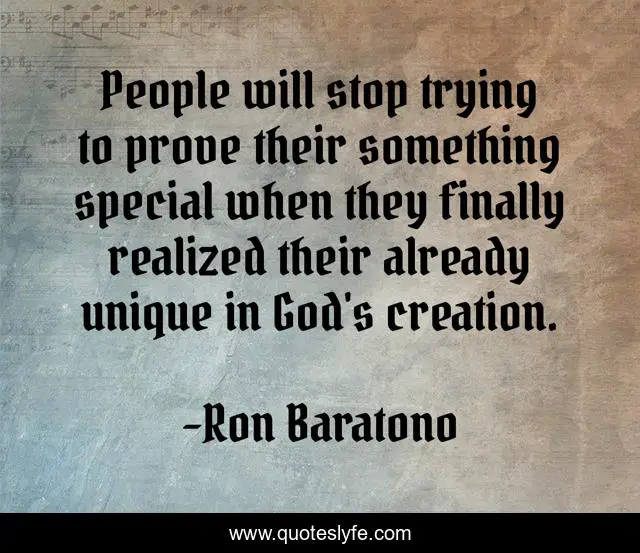 This page presents the quote "People will stop trying to prove their something special when they finally realized their already unique in God's creation.". Author of this quote is Ron Baratono. This quote is about god, attention, people,.