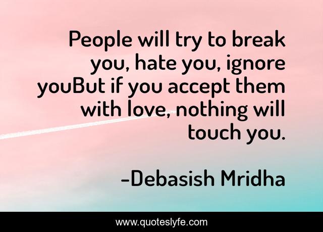This page presents the quote "People will try to break you, hate you, ignore youBut if you accept them with love, nothing will touch you.". Author of this quote is Debasish Mridha. This quote is about life, acceptance, love, mridha, debasish, philosophy, hate, affection,.