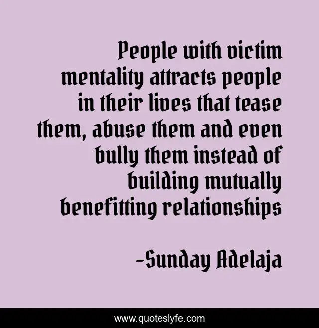 This page presents the quote "People with victim mentality attracts people in their lives that tease them, abuse them and even bully them instead of building mutually benefitting relationships". Author of this quote is Sunday Adelaja. This quote is about building, life, goal, relationship, tease, benefiting, mentality, mission, calling,.