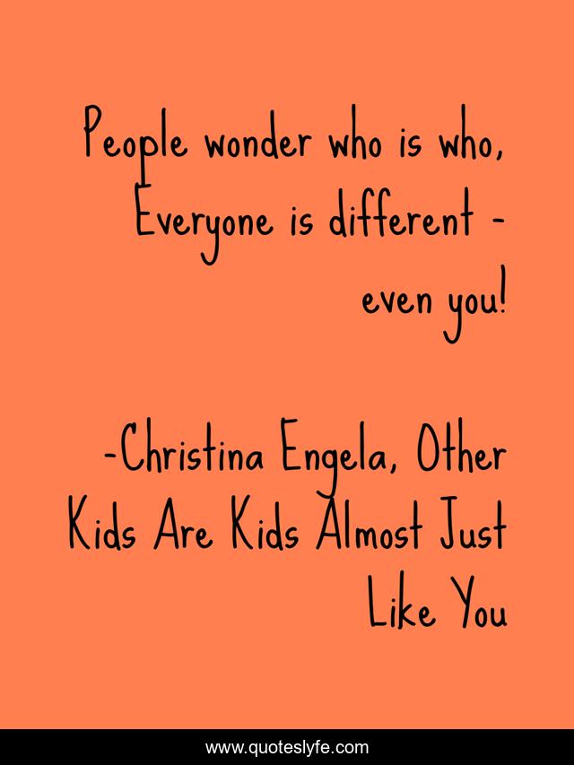 This page presents the quote "People wonder who is who, Everyone is different - even you!". Author of this quote is Christina Engela, Other Kids Are Kids Almost Just Like You. This quote is about different, everyone, people, wonder,.