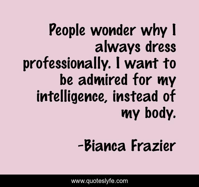 This page presents the quote "People wonder why I always dress professionally. I want to be admired for my intelligence, instead of my body.". Author of this quote is Bianca Frazier. This quote is about intelligence, professional-dress,.
