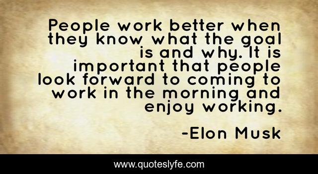 This page presents the quote "People work better when they know what the goal is and why. It is important that people look forward to coming to work in the morning and enjoy working.". Author of this quote is Elon Musk. This quote is about enjoy, goal, morning,.