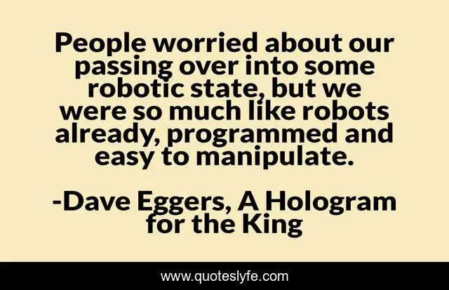 This page presents the quote "People worried about our passing over into some robotic state, but we were so much like robots already, programmed and easy to manipulate.". Author of this quote is Dave Eggers, A Hologram for the King. .