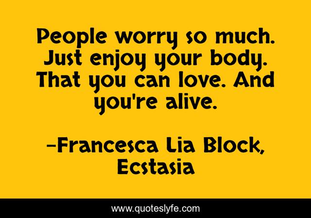 This page presents the quote "People worry so much. Just enjoy your body. That you can love. And you're alive.". Author of this quote is Francesca Lia Block, Ecstasia. This quote is about body, love, affection,.