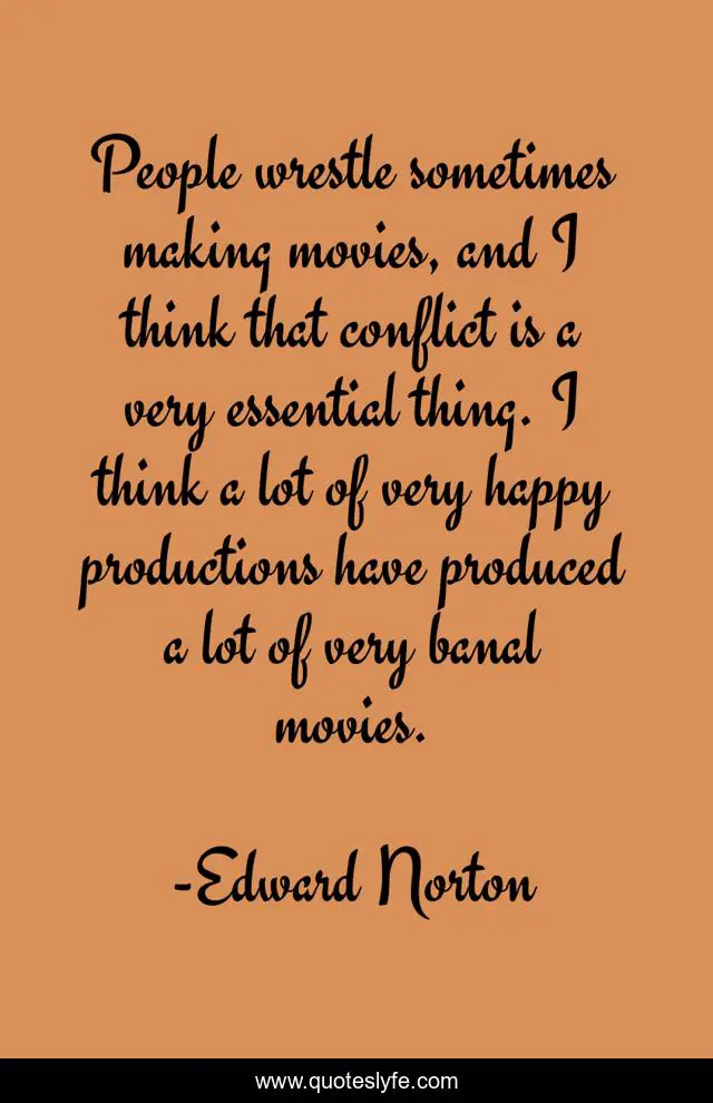This page presents the quote "People wrestle sometimes making movies, and I think that conflict is a very essential thing. I think a lot of very happy productions have produced a lot of very banal movies.". Author of this quote is Edward Norton. This quote is about happy, conflict, people,.