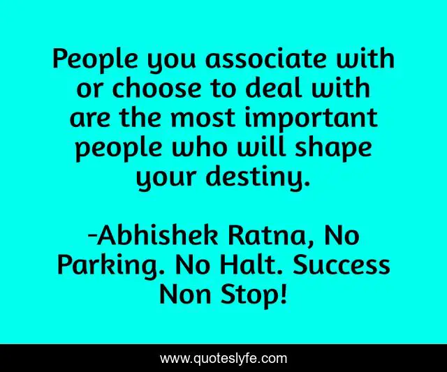 This page presents the quote "People you associate with or choose to deal with are the most important people who will shape your destiny.". Author of this quote is Abhishek Ratna, No Parking. No Halt. Success Non Stop!. This quote is about success-self-improvement, success-in-business, success,.