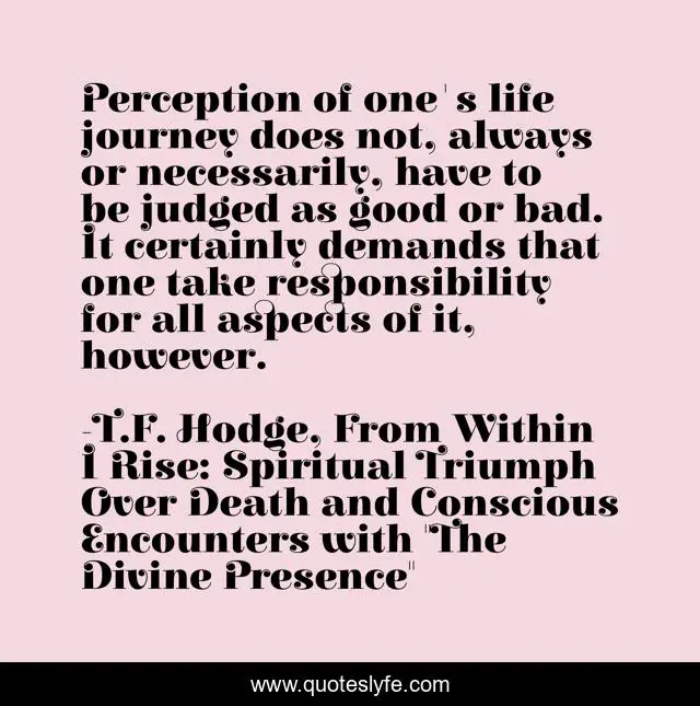 This page presents the quote "Perception of one's life journey does not, always or necessarily, have to be judged as good or bad. It certainly demands that one take responsibility for all aspects of it, however.". Author of this quote is T.F. Hodge, From Within I Rise: Spiritual Triumph Over Death and Conscious Encounters with "The Divine Presence". This quote is about life, good, positive, confidence, experience, negative, bad, journey, perception,.