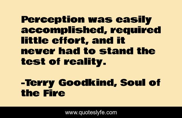 This page presents the quote "Perception was easily accomplished, required little effort, and it never had to stand the test of reality.". Author of this quote is Terry Goodkind, Soul of the Fire. This quote is about lies, perception, truth,.