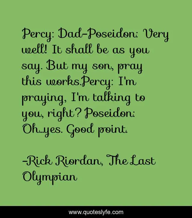 Percy: Dad-Poseidon: Very well! It shall be as you say. But my son, pray this works.Percy: I'm praying, I'm talking to you, right?Poseidon: Oh...yes. Good point.