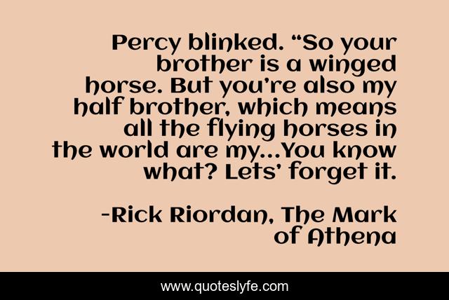 This page presents the quote "Percy blinked. “So your brother is a winged horse. But you’re also my half brother, which means all the flying horses in the world are my…You know what? Lets’ forget it.". Author of this quote is Rick Riordan, The Mark of Athena. This quote is about family, percy-jackson-and-the-olympians, percy-jackson, the-heroes-of-olympus, the-mark-of-athena, flying-horses,.