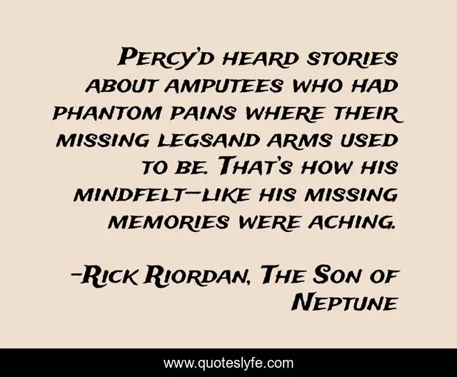 This page presents the quote "Percy’d heard stories about amputees who had phantom pains where their missing legsand arms used to be. That’s how his mindfelt—like his missing memories were aching.". Author of this quote is Rick Riordan, The Son of Neptune. .