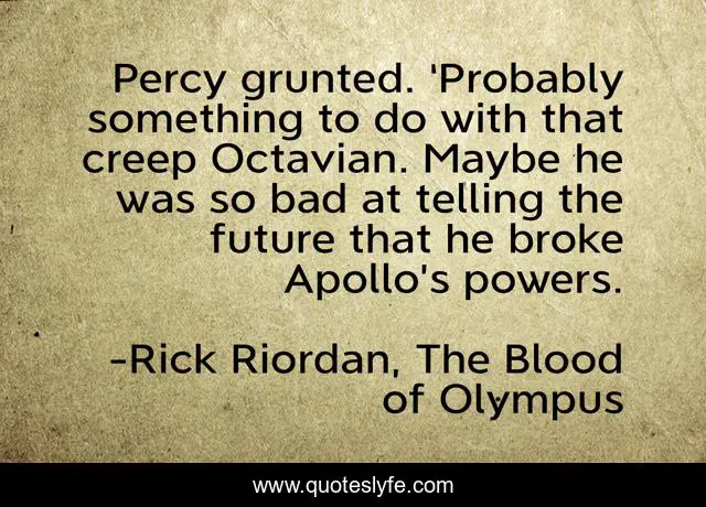 This page presents the quote "Percy grunted. ‘Probably something to do with that creep Octavian. Maybe he was so bad at telling the future that he broke Apollo’s powers.". Author of this quote is Rick Riordan, The Blood of Olympus. This quote is about octavian, prophecy, apollo, percy-jackson,.