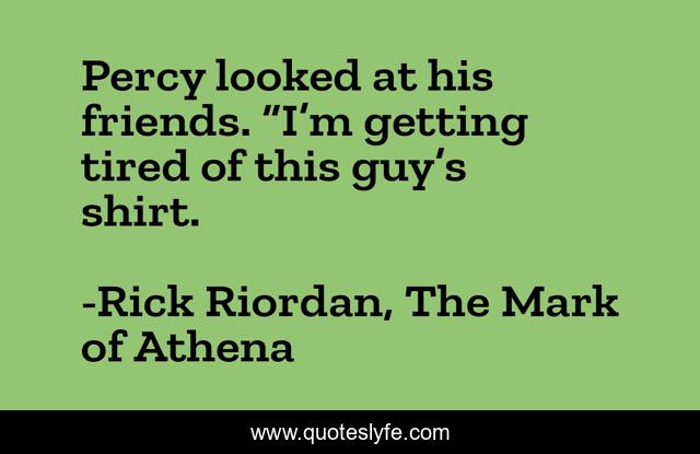 This page presents the quote "Percy looked at his friends. “I’m getting tired of this guy’s shirt.". Author of this quote is Rick Riordan, The Mark of Athena. This quote is about funny, comedy, i-can-t, humor, jkahsalolololololol,.
