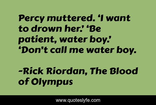 This page presents the quote "Percy muttered. ‘I want to drown her.’ ‘Be patient, water boy.’ ‘Don’t call me water boy.". Author of this quote is Rick Riordan, The Blood of Olympus. This quote is about percy-jackson, nike,.