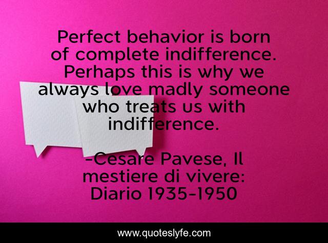 This page presents the quote "Perfect behavior is born of complete indifference. Perhaps this is why we always love madly someone who treats us with indifference.". Author of this quote is Cesare Pavese, Il mestiere di vivere: Diario 1935-1950. This quote is about indifference, love, unrequited-love, affection, behavior,.