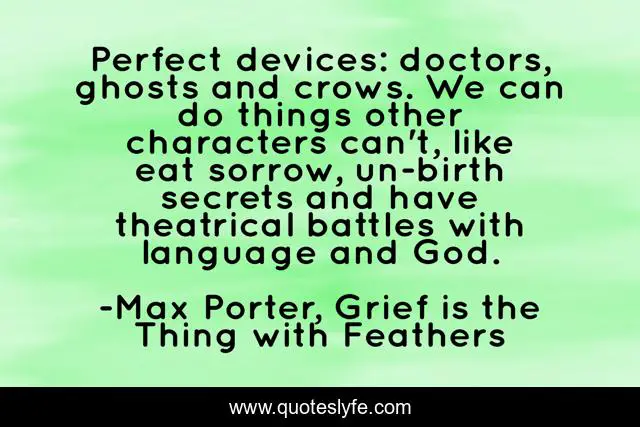 This page presents the quote "Perfect devices: doctors, ghosts and crows. We can do things other characters can't, like eat sorrow, un-birth secrets and have theatrical battles with language and God.". Author of this quote is Max Porter, Grief is the Thing with Feathers. This quote is about loss, language, doctor, secrets, grief, crows, religion-and-philoshophy, religion, ghosts,.