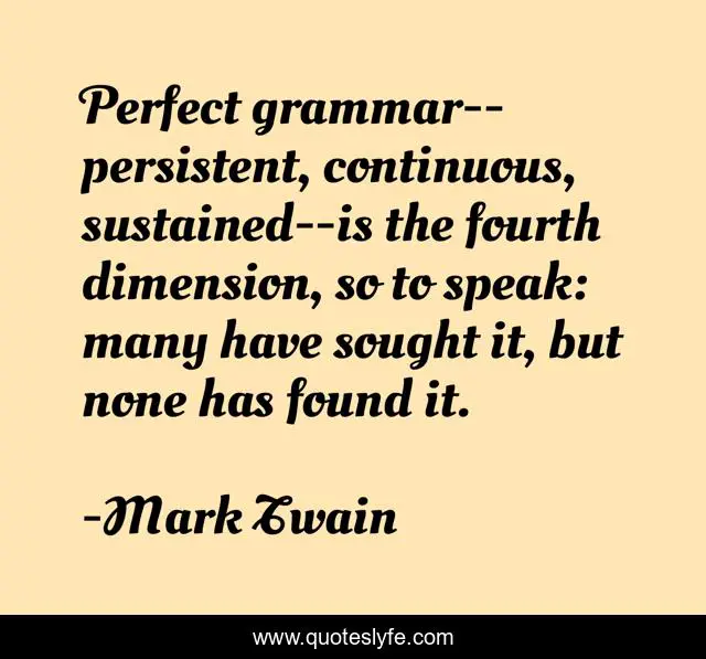This page presents the quote "Perfect grammar--persistent, continuous, sustained--is the fourth dimension, so to speak: many have sought it, but none has found it.". Author of this quote is Mark Twain. This quote is about grammar, perfection, writing,.