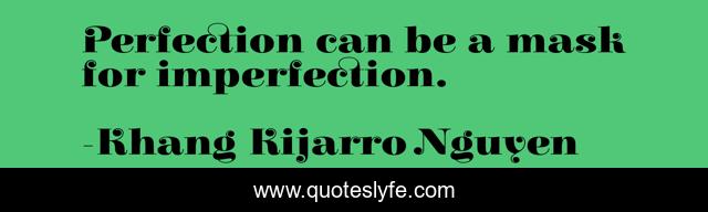 This page presents the quote "Perfection can be a mask for imperfection.". Author of this quote is Khang Kijarro Nguyen. This quote is about mask, imperfection, perfection,.