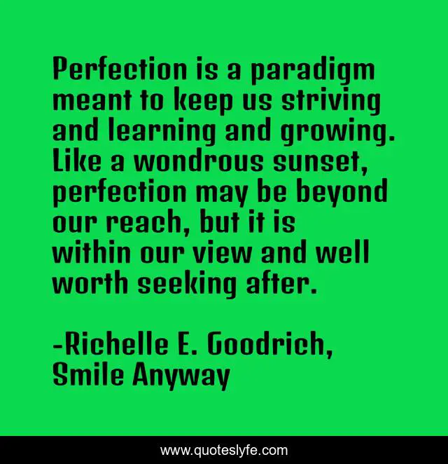 This page presents the quote "Perfection is a paradigm meant to keep us striving and learning and growing. Like a wondrous sunset, perfection may be beyond our reach, but it is within our view and well worth seeking after.". Author of this quote is Richelle E. Goodrich, Smile Anyway. This quote is about learn, richelle, perfection, progress, richelle-goodrich, paradigm, seek, grow, sunset,.