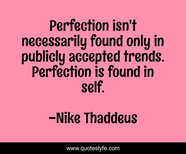 This page presents the quote "Perfection isn't necessarily found only in publicly accepted trends. Perfection is found in self.". Author of this quote is Nike Thaddeus. This quote is about opinions, fashion, trend, trends, be-the-trend, perfect, style, brides, sneakers,.