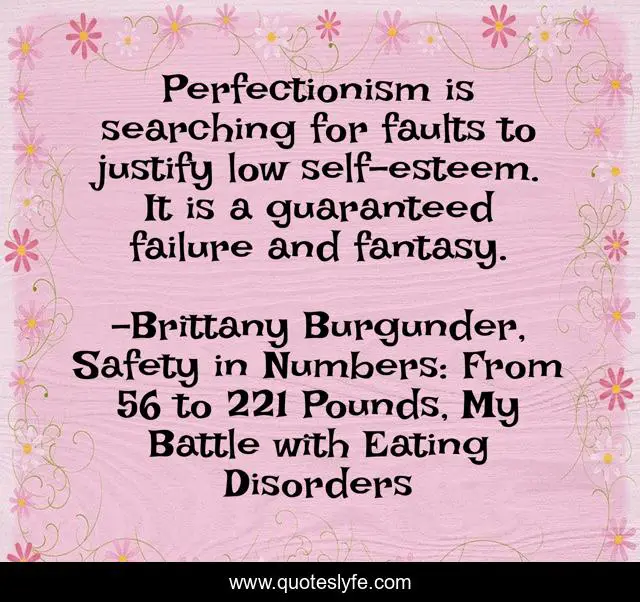 This page presents the quote "Perfectionism is searching for faults to justify low self-esteem. It is a guaranteed failure and fantasy.". Author of this quote is Brittany Burgunder, Safety in Numbers: From 56 to 221 Pounds, My Battle with Eating Disorders. This quote is about perfect, perfectionism, love-yourself, failure, brittany-burgunder, perfection, good-enough, low-self-esteem,.