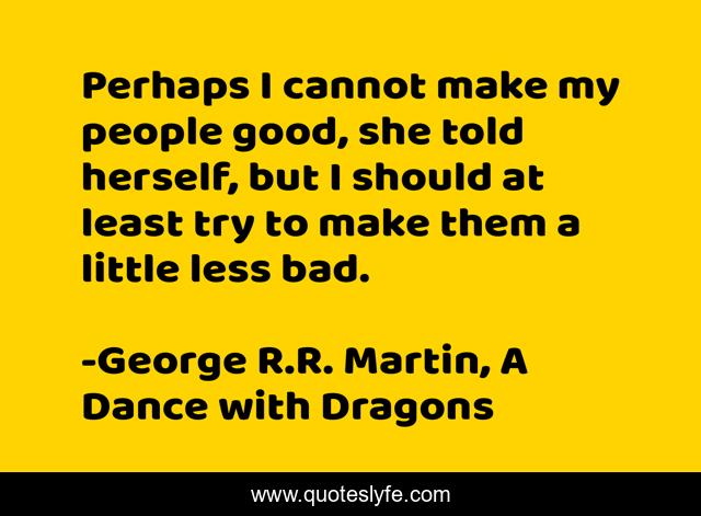 This page presents the quote "Perhaps I cannot make my people good, she told herself, but I should at least try to make them a little less bad.". Author of this quote is George R.R. Martin, A Dance with Dragons. This quote is about daenerys-targaryen, people, queen, bad, good, daenerys,.