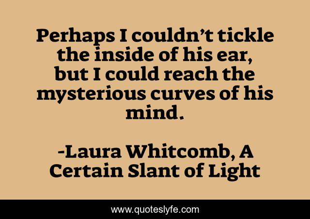 This page presents the quote "Perhaps I couldn’t tickle the inside of his ear, but I could reach the mysterious curves of his mind.". Author of this quote is Laura Whitcomb, A Certain Slant of Light. .