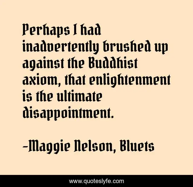 This page presents the quote "Perhaps I had inadvertently brushed up against the Buddhist axiom, that enlightenment is the ultimate disappointment.". Author of this quote is Maggie Nelson, Bluets. .