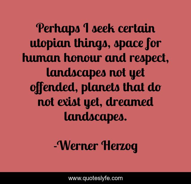 This page presents the quote "Perhaps I seek certain utopian things, space for human honour and respect, landscapes not yet offended, planets that do not exist yet, dreamed landscapes.". Author of this quote is Werner Herzog. This quote is about offended, human, space,.