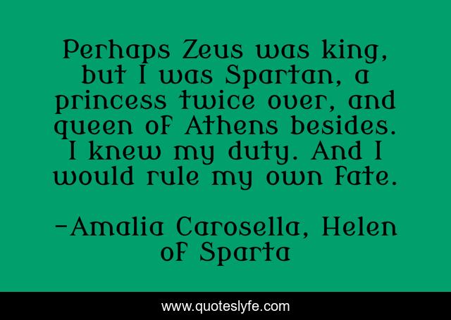 This page presents the quote "Perhaps Zeus was king, but I was Spartan, a princess twice over, and queen of Athens besides. I knew my duty. And I would rule my own fate.". Author of this quote is Amalia Carosella, Helen of Sparta. This quote is about greek-mythology, helen-of-sparta, historical-fiction,.