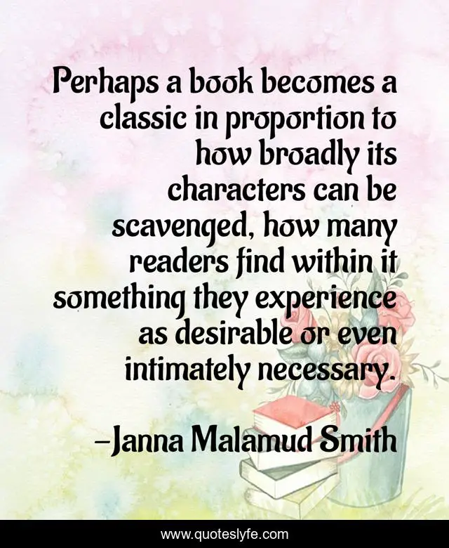 This page presents the quote "Perhaps a book becomes a classic in proportion to how broadly its characters can be scavenged, how many readers find within it something they experience as desirable or even intimately necessary.". Author of this quote is Janna Malamud Smith. This quote is about books, reading,.