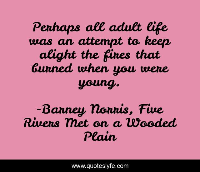 This page presents the quote "Perhaps all adult life was an attempt to keep alight the fires that burned when you were young.". Author of this quote is Barney Norris, Five Rivers Met on a Wooded Plain. .