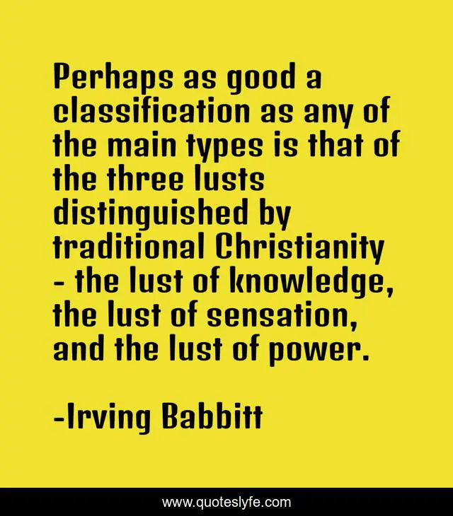 This page presents the quote "Perhaps as good a classification as any of the main types is that of the three lusts distinguished by traditional Christianity - the lust of knowledge, the lust of sensation, and the lust of power.". Author of this quote is Irving Babbitt. This quote is about good, three, power,.