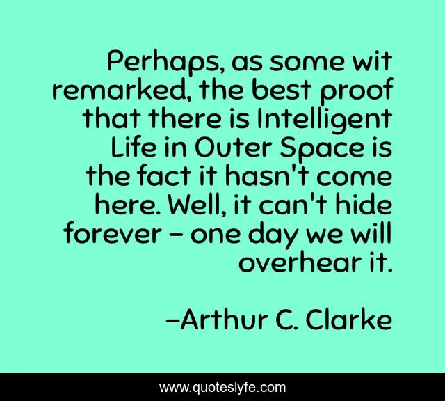 This page presents the quote "Perhaps, as some wit remarked, the best proof that there is Intelligent Life in Outer Space is the fact it hasn't come here. Well, it can't hide forever - one day we will overhear it.". Author of this quote is Arthur C. Clarke. This quote is about life, day, best,.