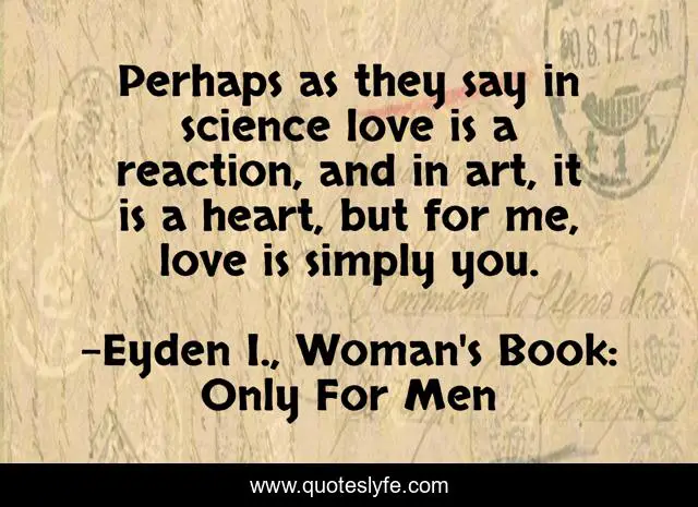 This page presents the quote "Perhaps as they say in science love is a reaction, and in art, it is a heart, but for me, love is simply you.". Author of this quote is Eyden I., Woman's Book: Only For Men. This quote is about heart, woman, art, reaction, science, love, affection,.