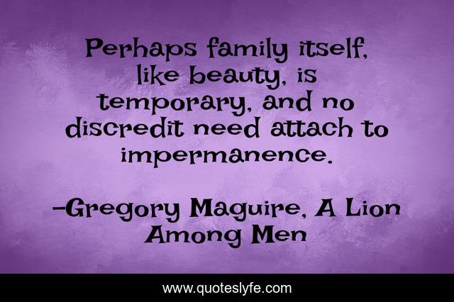 This page presents the quote "Perhaps family itself, like beauty, is temporary, and no discredit need attach to impermanence.". Author of this quote is Gregory Maguire, A Lion Among Men. This quote is about abandonment, impermanence, family,.