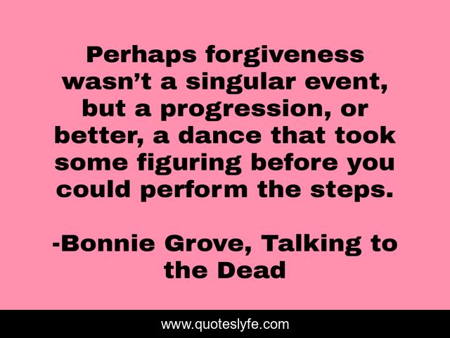 This page presents the quote "Perhaps forgiveness wasn’t a singular event, but a progression, or better, a dance that took some figuring before you could perform the steps.". Author of this quote is Bonnie Grove, Talking to the Dead. This quote is about literature, psychological-drama, contemporary-fiction,.