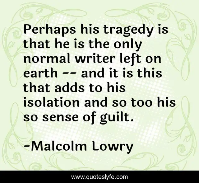 This page presents the quote "Perhaps his tragedy is that he is the only normal writer left on earth -- and it is this that adds to his isolation and so too his so sense of guilt.". Author of this quote is Malcolm Lowry. .