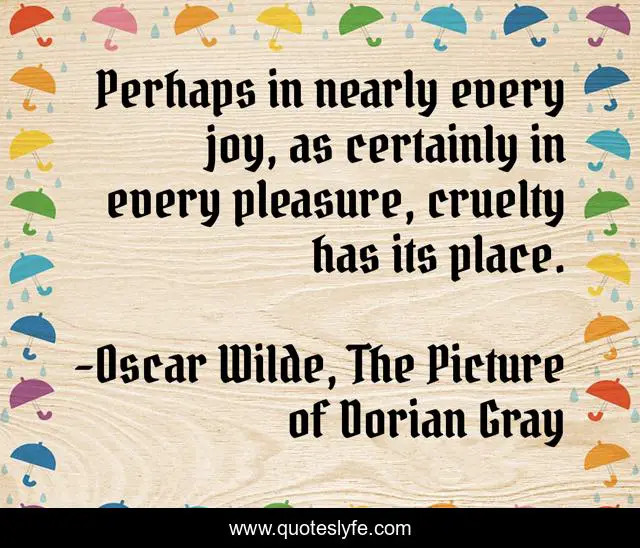 This page presents the quote "Perhaps in nearly every joy, as certainly in every pleasure, cruelty has its place.". Author of this quote is Oscar Wilde, The Picture of Dorian Gray. This quote is about joy, cruelty, pleasure,.