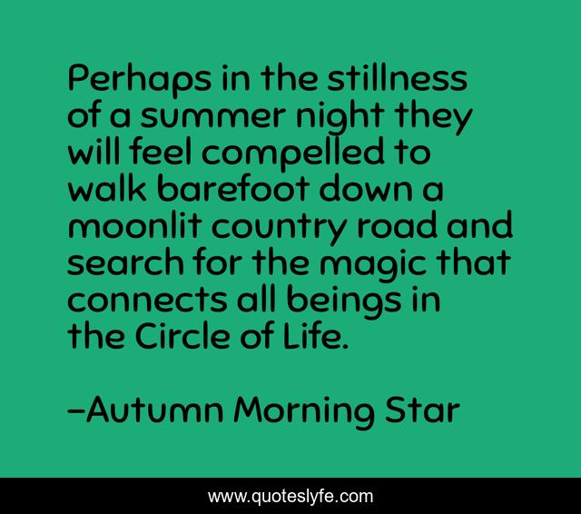 This page presents the quote "Perhaps in the stillness of a summer night they will feel compelled to walk barefoot down a moonlit country road and search for the magic that connects all beings in the Circle of Life.". Author of this quote is Autumn Morning Star. This quote is about enthusiasm, magicians, magic, women-s-inspirational, inspirational,.