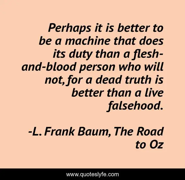 This page presents the quote "Perhaps it is better to be a machine that does its duty than a flesh-and-blood person who will not, for a dead truth is better than a live falsehood.". Author of this quote is L. Frank Baum, The Road to Oz. This quote is about lies, truth,.